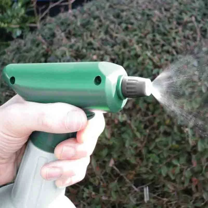 The nozzle can be adjusted to produce a fine jet or a wide fan suitable for misting plants. A graduated bottle allows for precise measurement and easy mixing. The sprayer is designed to be powered by two AA batteries, which provide about 90 minutes of spraying time.