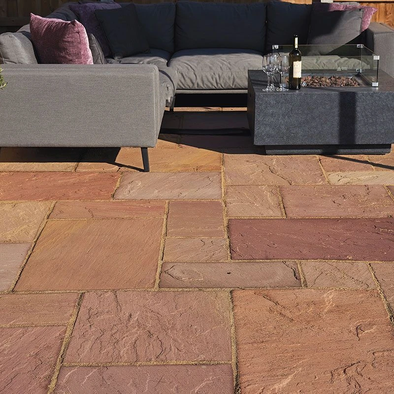 Tumbled sandstone paving is a type of sandstone paving that has undergone a special manufacturing process to achieve a unique, weathered look. The process involves tumbling the sandstone in a machine with other stones, gravel, or steel bearings, which causes the stones to rub against each other and smooth out any sharp edges or corners. This creates a softer, more rounded appearance that mimics the natural weathering process. With a naturally riven finished sandstone, the tumbling process removes the newness of of the surface and edges of the stone to give a gentle riven texture and slightly rounds the edges of the stone to give the appearance of a stone that is much older than it actually is making it suitable for period homes where a new stone would look out of place. If a product is sawn and then tumbled, it retains the flat, clean cut appearance, however has a softer finish to the edges to give an aged appearance. It is often produced in a calibrated thickness where the variation in the thickness of the slab is kept to a minimum to simplify the laying process.