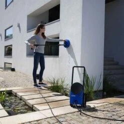 Check out this Kew Nilfisk power control pressure washer that is ideal for your paving, cars and much more. The user guide on the machine shows you the correct nozzle to select for different types of cleaning, the variety of nozzles are perfect for versatile cleaning. Simply adjust the power control using the dial, that allows you to clean soft and hard surfaces removing the most stubborn of stains with out leaving any residue behind. The 6-metre hose is easily stored away by reeling behind the machine and can be retracted from the reel without any damage or tangling. Complete with wheels, you can conveniently manoeuvre this pressure washer around and can be compactly stored away when not in use.