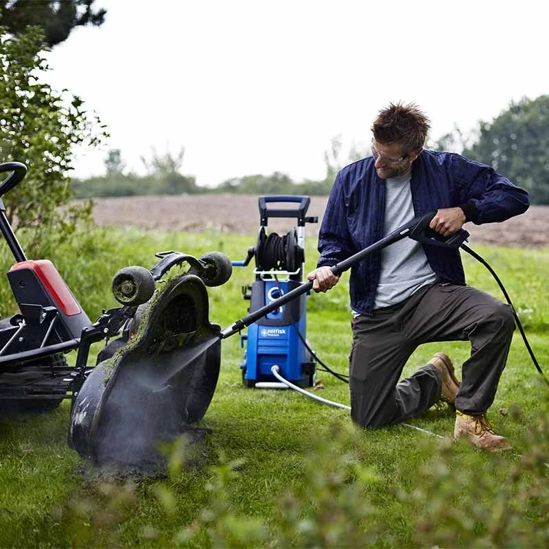 Check out this Kew Nilfisk Kew Premium pressure washer that is perfect for industrial use and ideal for your swimming pools, trailers and much more. Select from a wide range of nozzles for different types of cleaning, the rough and gentle nozzles are perfect for versatile cleaning. Simply adjust the power control using the dial (choose from 60%-100%), that allows you to clean soft and hard surfaces removing the most stubborn of stains without leaving any residue behind. The 10-metre hose is easily stored away by reeling it on to the top of the machine and retracts around the reel without any damage or tangling. The reliable and long-lasting air-cooled motor, auto stop start function and on-board detergent, are just a few of you features this pressure washer has. Complete with wheels, onboard lance, and gun holder, you can conveniently manoeuvre this pressure washer around and can be compactly stored away when not in use.
