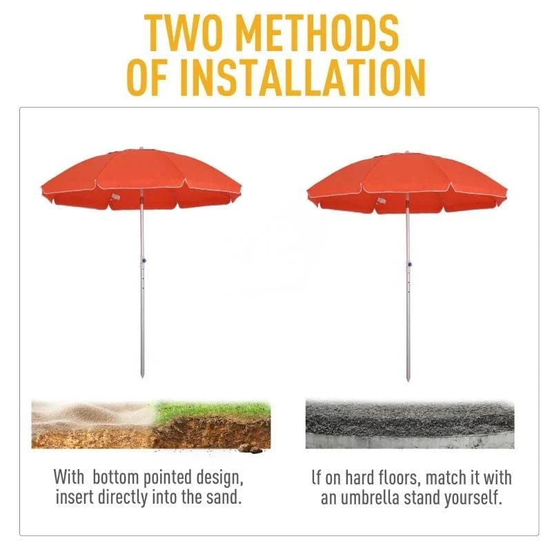 The Outsunny Beach Umbrella is made of aluminium, a reliable material. The patio parasol can be positioned to offer protection due to three different levels of angle adjustment, and a top vent allows air to flow easily in and out. The beach umbrella is very easy to set up since it has a pointed bottom that can be pushed into the stand to keep it in place. Using a blue button, the canopy can be opened and closed easily. It is easy to put together and has a carry bag.