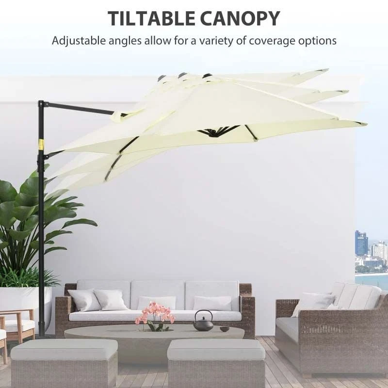 Outsunny is an offset cantilever umbrella that offers ample shade from sunlight at an angle you control. It has a vented canopy that helps it stay stable against the wind and a 360-degree rotation for full shade. It is made of outdoor-ready polyester fabric and a powder-coated steel frame for heavy-duty stability. It has a push handle to quickly open and shut and a strap to keep the fabric secure when not in use. Two screws are used to secure the pole to the stand.
