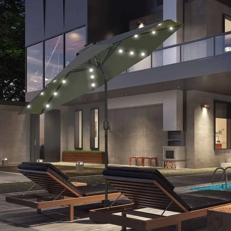 p>Stay cool and protected from the sun with the Outsunny Sun Umbrella. Crafted with superior materials and excellent workmanship, this umbrella offers reliable shade on hot and sunny days. It features 24 solar-powered LED lights that provide energy-efficient lighting, making your outdoor space comfortable and inviting even at night. The umbrella is designed with 8 stable ribs, easy tilt operation, and a hand-crank lift for convenient adjustment. The solid metal frame is covered with anti-fade and UV-resistant PE fabric for long-lasting use. With its stylish design and durable construction, this sun umbrella is a great addition to any outdoor area. Stand not included.