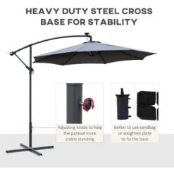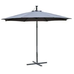 Outsunny 2.95m LED Patio Banana Umbrella Cantilever Parasol with Crank Cross Base – Grey – 84D-066GY