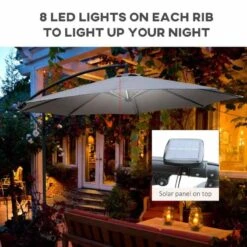 Outsunny’s garden parasol with base makes summer evenings last longer. Rust-proof frame with eight aluminium ribs connecting to the canopy provides support. The UV-resistant canopy shields you and your guests from the sun and light rain. The large spherical parasol has eight cool white solar-powered LED light strips that provide soothing light when the sun goes down and do not require a battery. steel cross base is provided (weights are not provided). Assembly is necessary.