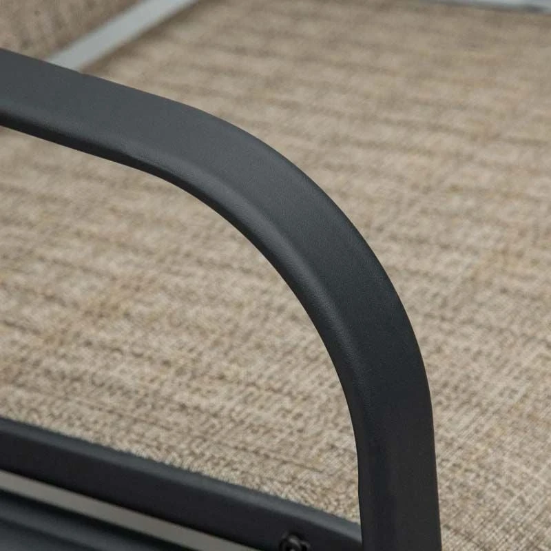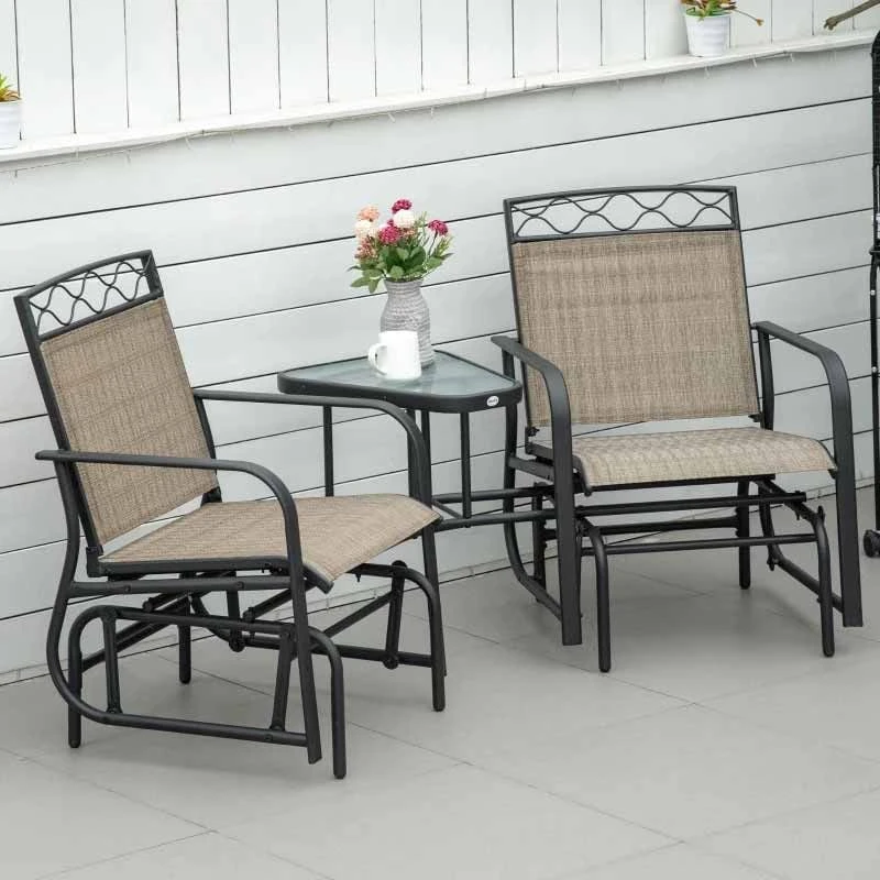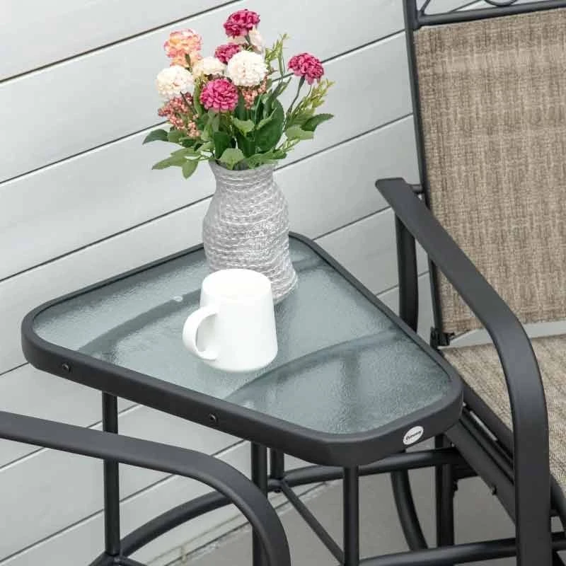 If you are looking for a modern design piece of furniture to complement your outdoor living space, this Outsunny rocking garden chair set is the one for you. Constructed from a strong metal powder coated frame, this garden bench will last for years to come. Covered in a texeline material, it will be protected from the elements by draining water and will circulate air to keep you cool on warm summer days. The gliding arms will gently rock you back and forth keeping you completely relaxed for hours on end. With a deep seat, high back and curved arm rest, this garden chair will keep you supported and comfortable all day long. Featuring a beautiful cut out weave design along the top edge of the seats this garden chair set is elegant and will certainly be a talking point amongst you and your company. Complete with a tempered glass central table perfect for you and a friend to rest your drink or book.