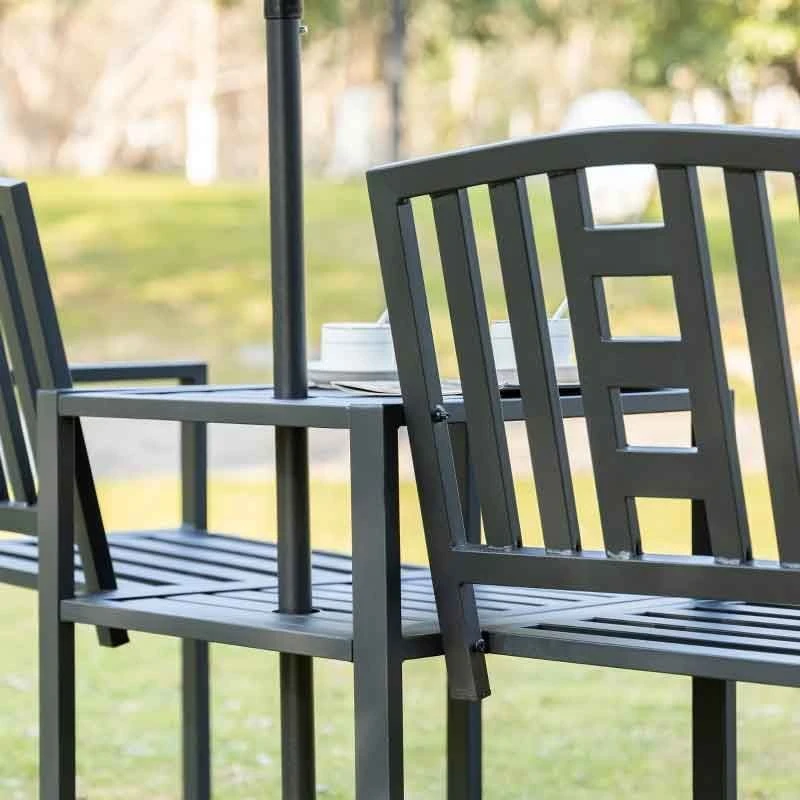 Enjoy your garden with this Outsunny combined seat and coffee table garden bench. The central table features a parasol hole for an umbrella to keep you shaded on hot summer days. Constructed from a sturdy metal, this garden bench is durable and will last for years to come. Powder coated, this bench is protected from the elements and prevents rusting and peeling. Slatted all over that drains water and circulates air to keep you cool. The deep seat and angled backrest will keep you and a friend comfortable and supported for hours on end.