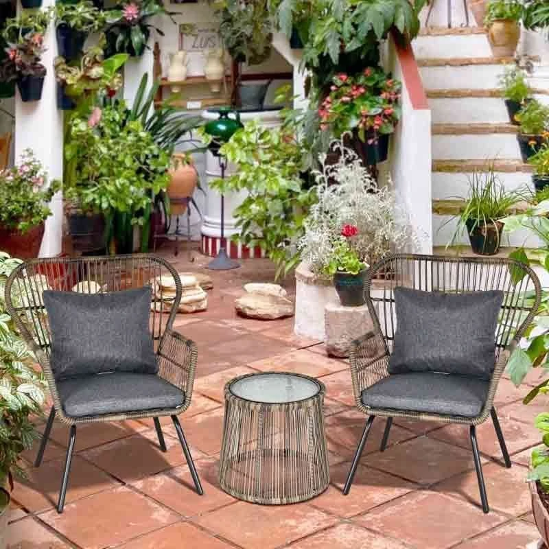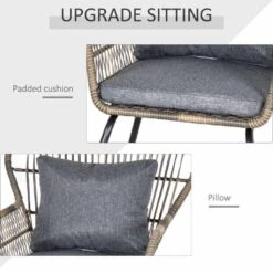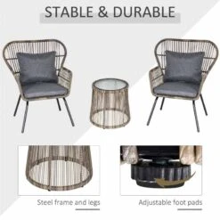 Outsunny’s three-piece set includes two chairs and a matching table Ideal for gardens, small balconies, and other outside areas. A classy bistro set that stands out brilliantly and is supported by a strong steel frame that is covered in PE wicker in a unique webbed pattern. Adjustable foot pads for balance. The padded cushions are part of the ensemble. Assembly necessary.