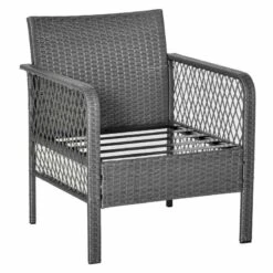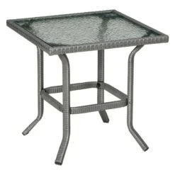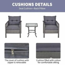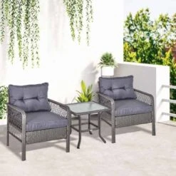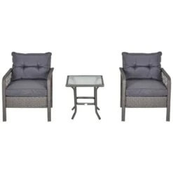 The Outsunny 3-piece bistro set is perfect for outdoor spaces like patios, gardens, balconies, and pools. Three-piece set includes two chairs and a round table with glass top with storage. The chairs are constructed of beautiful PE rattan weave on a sturdy metal frame, making them water-resistant and long-lasting. The bistro comes with thick seat cushions for comfort. Covers are removable and washable. Assembly required.