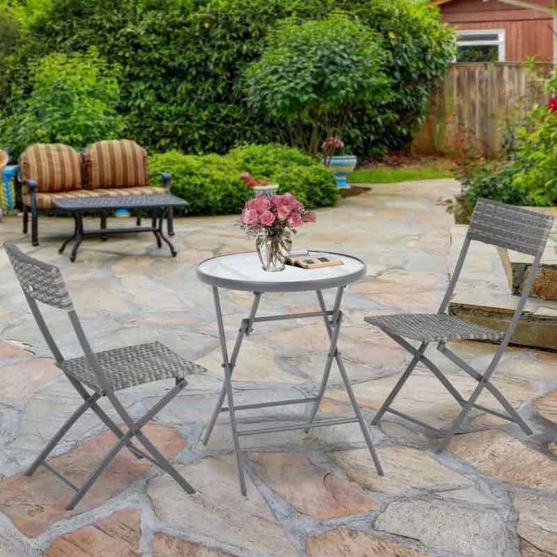 Outsunny’s charming bistro set includes two chairs and a round coffee table. This bistro set is foldable and has a wonderful woven appearance that quickly enhances any existing decor. In addition, the set provides compact convenience. This set is constructed with a steel frame and tough PE rattan wicker. The tempered glass tabletop on the circular table makes wiping it down with a damp cloth simple. This set has reliable durability and is designed to resist almost any kind of weather condition.