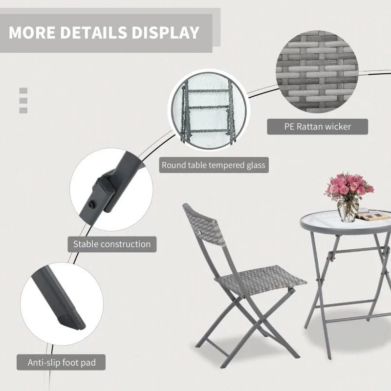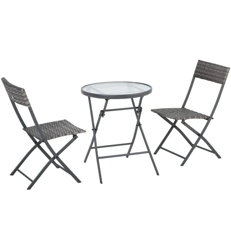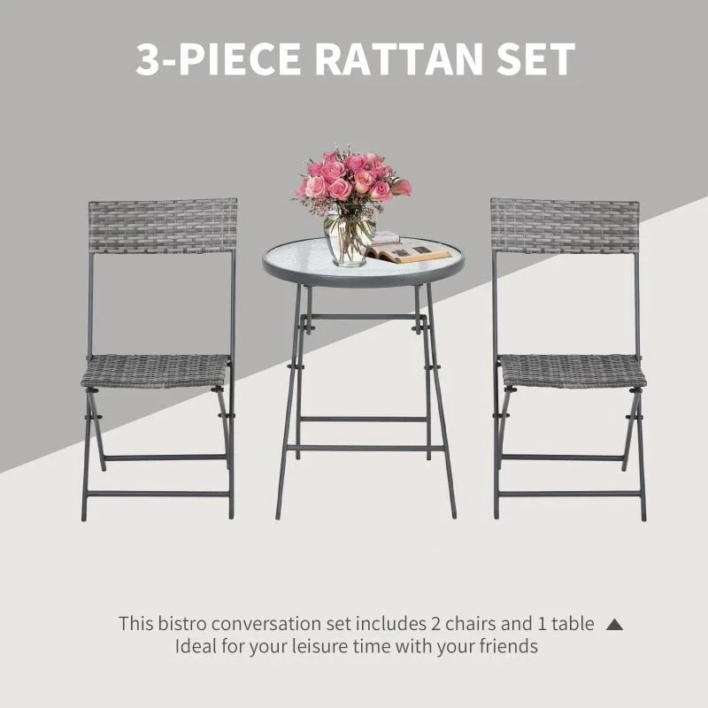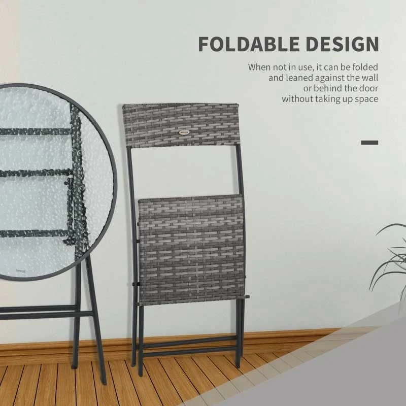 Outsunny 2-Seater Patio Wicker Bistro Set Foldable Table and Chair Set for Outdoor Yard – Grey – 863-069