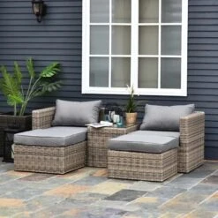 Check out this Outsunny 5-piece rattan garden furniture set with 2 armchairs, 2 foot stools and a small side table that we can be sure will compliment your outdoor living space perfectly. The design mean you can arrange into a positions of your liking and tuck the furniture set into a nice corner of your garden making the most out of your space. Constructed from a metal frame and covered in a PE rattan wicker, this garden furniture set is durable, strong and will last for years to come. The extra wide seats, high backs and armrests will keep you and a friend supported and completely comfortable for hours on end. The thick cushions, each have a zip making them easy to remove to wash and maintain yourself at home. The coffee table is light weight so is easily manoeuvred to your preferred position, ideal for resting your drinks and snack bowls and finished off with an elegant glass top. Sit back and relax with your feet up on the foot stools or use as additional seating to entertain a few others. If you are looking for a stylish and unique design rattan garden furniture set, this is the one for you.