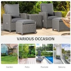 Check out this Outsunny 6-piece rattan garden furniture set with 2 armchairs, 2 foot stools, a small side table and furniture cover that we can be sure will compliment your outdoor living space perfectly. The design mean you can arrange into a position of your liking and tuck the furniture set into a nice corner of your garden making the most out of your space. Constructed from a metal frame and covered in a PE rattan wicker, this garden furniture set is durable, strong and will last for years to come. The extra wide seats, high backs and armrests will keep you and a friend supported and completely comfortable for hours on end. The thick cushions, each have a zip making them easy to remove to wash and maintain yourself at home. The coffee table is light weight so is easily manoeuvred to your preferred position, ideal for resting your drinks and snack bowls and finished off with an elegant glass top. Sit back and relax with the reclining backs with your feet up on the foot stools or use as additional seating to entertain a few others. If you are looking for a stylish and unique design rattan garden furniture set complete with a protective cover, this is the one for you.