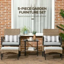 Check out this Outsunny 5-piece rattan garden furniture set with 2 armchairs, 2 foot stools and a small side table that we can be sure will compliment your outdoor living space perfectly. The design mean you can tuck the furniture set into a nice corner of your garden making the most out of your space. Constructed from a metal frame and covered in a PE rattan wicker, this garden furniture set is durable, strong and will last for years to come. The extra wide seats, high backs and armrests will keep you and a friend supported and completely comfortable for hours on end. The thick cushions, each have a zip making them easy to remove to wash and maintain yourself at home. The coffee table is light weight so is easily manoeuvred to your preferred position, ideal for resting your drinks and snack bowls and finished off with an elegant wood effect top. Sit back and relax with your feet up on the foot stools or use as additional seating to entertain a few others. If you are looking for a stylish and unique design rattan garden furniture set, this is the one for you.