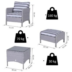 - Weight Capacity: 160kg (armchair), 70kg (ottoman), 30kg (table)