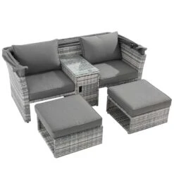 Check out this Outsunny 3-piece rattan garden furniture set with 2 seater sofa with middle table and 2 foot stools that we can be sure will compliment your outdoor living space perfectly. The design mean you can tuck the furniture set into a nice corner of your garden making the most out of your space. Constructed from a metal frame and covered in a PE rattan wicker, this garden furniture set is durable, strong and will last for years to come. The extra wide seats, high back and armrests will keep you and a friend supported and completely comfortable for hours on end. The thick cushions, each have a zip making them easy to remove to wash and maintain yourself at home. Keep shaded on warm summer days with the added canopy or lay the hood flat to catch some rays. The central table is handy to rest your drinks and snack bowls with a glass top finish for easy cleaning and complete with a cupboard. Sit back and relax with your feet up on the foot stools or use as additional seating to entertain a few more, when not in the they can be compactly stored away under your seats. If you are looking for a relaxing and unique design rattan garden furniture set with a cover included, this is the one for you.
