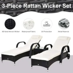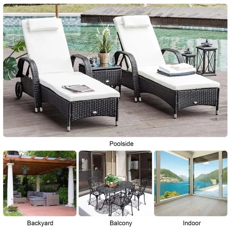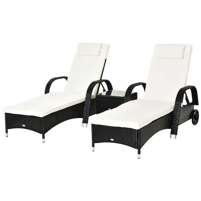 Check out this stunning Outsunny rattan reclining garden sun lounger set that we can be sure will compliment your outdoor living space perfectly. Constructed from a high-quality metal frame and wrapped in a rattan wicker, this sun lounger set is strong, durable, easy to clean and will last for years to come. You and a friend can sit back using the 5-level reclining back rest function and curved armrest for ultimate relaxation, the added bed cushions and head pillows will keep you both supported and comfortable for hours on end. The handy side table is ideal for resting your drinks and snack bowls and is finished off with an elegant glass top. Complete to two rear wheels on both sun loungers enabling you to easily manoeuvre the loungers to your preferred position around your garden. If you are looking for a beautifully designed rattan sun lounger set, this is the one for you.