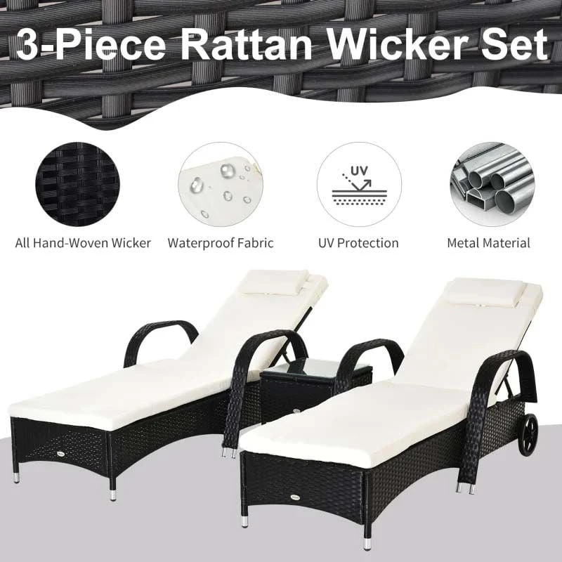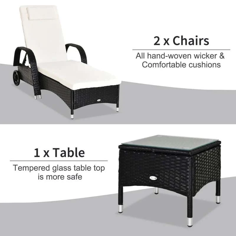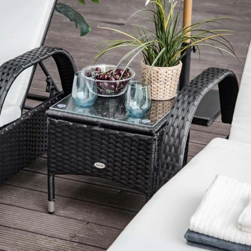 Outsunny 2-Seater Rattan Sun Lounger Set with Side Table – Black – 862-010BK