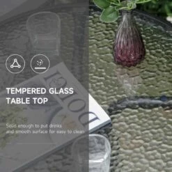 The 3-piece outdoor garden patio furniture set from Outsunny includes a tempered glass-top table and two folding chairs. The four claw-shaped legs on the table base provide it stability and strength. The best comfort is offered by curving arms with sling fabric seats. The tempered glass guarantees durability and easy cleaning. A frame made of steel guarantees sturdiness and durability. Assembly required.