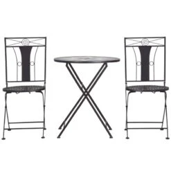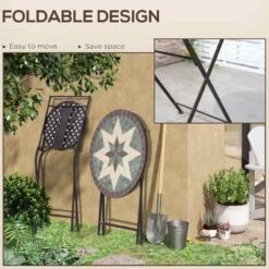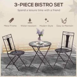 The Outsunny 3-piece bistro set is ideal for relaxing in outdoor areas like patios, balconies, and gardens. Three-piece set include two seats and a round table. The metal frames are sturdy and durable. The mosaic tile table is a mix of classic and modern, with a star shape. The foldable design makes it easy to store and carry. Assembly is necessary.