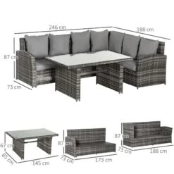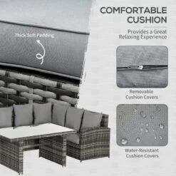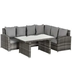 Check out this Outsunny 3-piece rattan garden sofa set with 2 three seater sofas and a large matching table that we can be sure will compliment your outdoor living space perfectly. The modern L-shaped design means you can tuck the sofa into a nice corner of your garden making the most out of your space. Constructed from a metal frame and covered in a PE rattan wicker, this garden sofa set is durable, strong and will last for years to come. The extra wide seats, high back and arm rests will keep you and a few friends supported and completely comfortable for hours on end. The thick cushions, each have a zip making them easy to remove to wash and maintain yourself at home. The dining table is spacious with enough room for you and your company to eat dinner around, the table is also finished off with an elegant glass top making it easy to clean. If you are looking for a relaxing and modern rattan garden sofa set, this is the one for you.