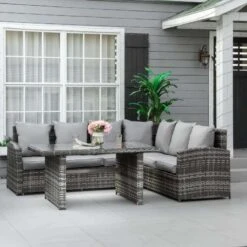 Check out this Outsunny 3-piece rattan garden sofa set with 2 three seater sofas and a large matching table that we can be sure will compliment your outdoor living space perfectly. The modern L-shaped design means you can tuck the sofa into a nice corner of your garden making the most out of your space. Constructed from a metal frame and covered in a PE rattan wicker, this garden sofa set is durable, strong and will last for years to come. The extra wide seats, high back and arm rests will keep you and a few friends supported and completely comfortable for hours on end. The thick cushions, each have a zip making them easy to remove to wash and maintain yourself at home. The dining table is spacious with enough room for you and your company to eat dinner around, the table is also finished off with an elegant glass top making it easy to clean. If you are looking for a relaxing and modern rattan garden sofa set, this is the one for you.