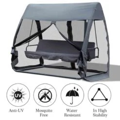 This 3-person Outsunny Convertible swing chair is a must-have for your outdoors. Easily converts to a bed within seconds. The zippered net and UV-resistant canopy keep you protected from mosquitoes and harmful UV rays while you enjoy a relaxing time. The padded cushion on the seat and back offers extra comfort for longer hours. The bag on the side holds your bottles and magazines. Strong and sturdy steel frames provide great support for years to come.