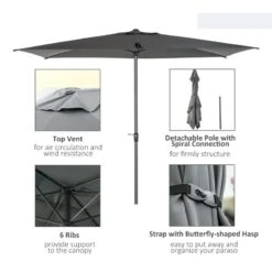 Shield yourself from the sun in simple style with the Outsunny Outdoor Parasol. The durable and tough aluminium pole ensures longevity, while the polyester canopy provides reliable outdoor protection. Adjusting the angle is easy with the convenient operation button. Six metal ribs offer extra strength and support between the canopy and the aluminium structure. This garden parasol effortlessly combines beauty and functionality, adding elegance to your outdoor dining area. Please note that assembly is required, and the base is not included.