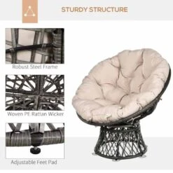 Relax and enjoy the brighter days with this 360-degree swivel Outsunny garden chair. The modern round design adds a stylish feature to your outdoor area. 360° swivel allows you to turn around to your favourite side easily. The large plush cushion offers hours of comfort with its secured tie fastenings keeping the cushion securely in place. Crafted out from PE rattan, the base is weather-resistant and low maintenance. Powder-coated steel frame underneath adds extra support. The chair is also light in weight allowing it to be moved to your favourite corner.