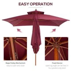 Add a touch of elegance and practicality to your garden with this Outsunny patio umbrella in wine red. The bamboo post and polyester cloth top make it a stylish and durable accessory that provides protection from direct sunlight. Whether used as a stand-alone umbrella or paired with patio furniture, it enhances any outdoor space. The double pulley configuration allows for easy opening and closing using the pull rope. With its 8-rib construction, this parasol umbrella offers ample shade coverage. It is portable, foldable, and lightweight, making it convenient to move and store. Designed for outdoor environments, it features environment-friendly painting. A perfect choice for gardens, parks, courtyards, and decks.
