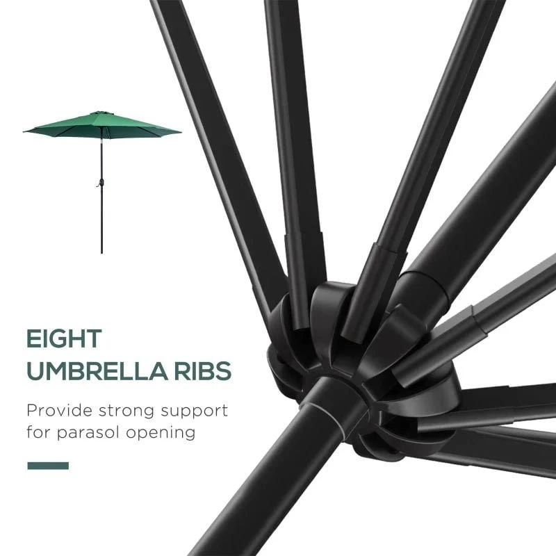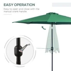 Elevate your outdoor experience with the Outsunny Sunshade for Garden. Designed to provide reliable sun protection, this garden parasol features a sturdy steel pole for stability and eight steel ribs for added strength. The adjustable-angle canopy covers a large area, ensuring ample shade for your outdoor activities. The crank handle allows for easy opening and closing of the canopy, and it also adjusts the canopy angle to suit your preferences. The sun umbrella is portable, foldable, and lightweight, making it convenient to transport and store. Please note that the base is not included, and it is recommended not to leave the umbrella open in heavy rain. With its vibrant green color and durable construction, this patio umbrella is perfect for every garden, patio, and outdoor area. It comes with a manual for easy setup.