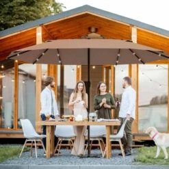 Outsunny’s solar parasol has a stylish design with 36 lights on the frame ribs to illuminate your outdoor meals as the sun goes down. The massive double parasol garden gives plenty of shade, protecting you from harsh sunlight. It has a crank mechanism for quick opening and closing, a large canopy for plenty of protection, top vents to keep the wind out, and 12 ribs between the steel frame and canopy for added strength. This item must be put together.