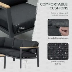 Check out this Outsunny 4pcs garden furniture set, complete with 2 love seats, 1 corner sofa and a coffee table, perfect for you and your family and friends to enjoy each-others company in the comfort of your own garden. The included cushions on the seat and back rests will keep you supported and comfortable for hours on end and the zipper covers are easily removed to be washed and maintained. The compact side table is ideal for resting multiple drinks and snack bowls, it is also lightweight so can be manoeuvred to your preferred position. Constructed from a strong metal frame, this garden set is durable, weather resistant and will last for years to come. The arm rests and table top is finished off with an elegant wood top so we can be sure the modern design is ideal for any outdoor living space and will compliment your garden perfectly.