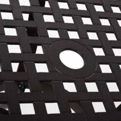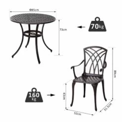 With a compact design, perfect for small outside areas, This five-piece Stamford set from Outsunny consists of four bistro chairs and a matching table, with cast aluminium forming the frame of all three pieces to ensure they are sturdy and tough, as well as being resistant to rusting and mild everyday wear-and-tear. Round in shape, the table features a middle hole to keep a sun parasol securely in place, with the back of the chairs showcasing a cut-out design for an attractive finish whether seated or not. Ideal for flats and apartments with balconies.