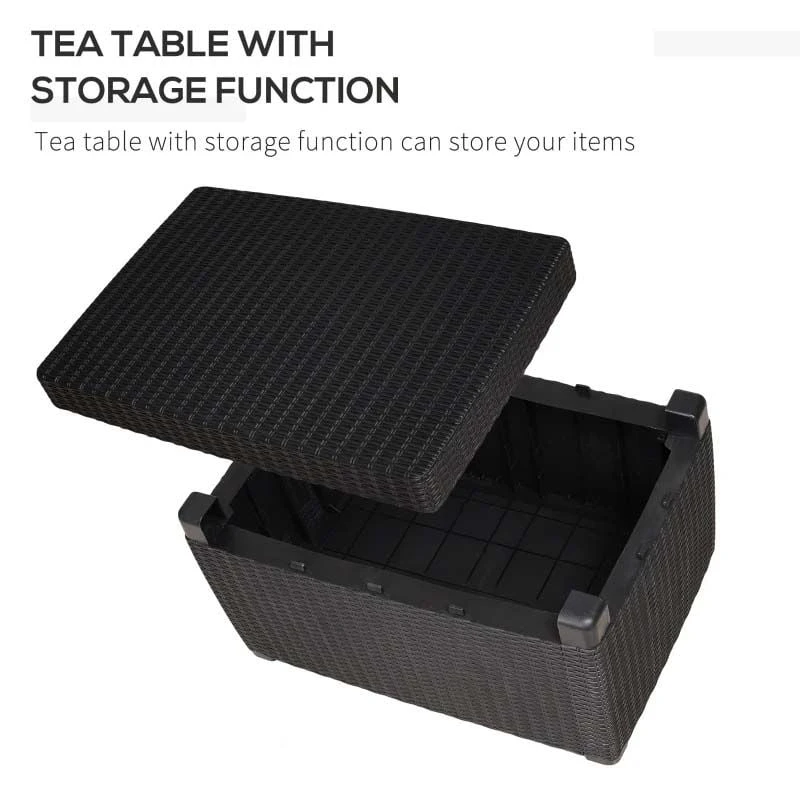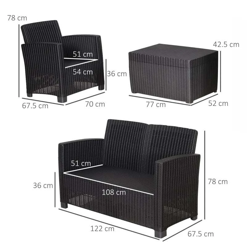 Check out this Outsunny 4-piece rattan effect garden furniture set with 2 armchairs, love seat and coffee table that we can be sure will compliment your outdoor living space perfectly. The design mean you can tuck the furniture set into a nice corner of your garden making the most out of your space. constructed from PP plastic, this garden furniture set is durable, strong and will last for years to come. The extra wide seats, high back and arm rests will keep you and a few friends supported and completely comfortable for hours on end. The thick cushions, each have a zip making them easy to remove to wash and maintain yourself at home. The coffee table is light weight so is easily manoeuvred to your preferred position, what more, there is also ample of space in the underneath storage box for garden toys and blankets, which can be secured away with the table top lid. If you are looking for a relaxing and classic design rattan effect garden furniture set, this is the one for you.