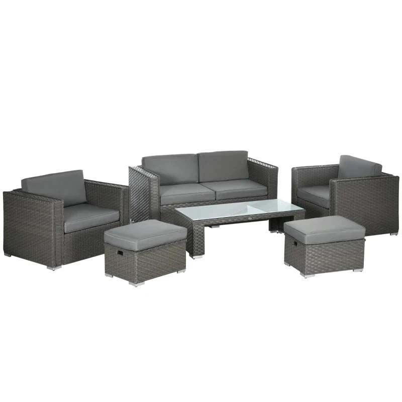 Check out this Outsunny 6-piece rattan garden furniture set with a 2 single sofa, 2 foot stools, 2-seater sofa and coffee table that we can be sure will compliment your outdoor living space perfectly. The modern designs mean you can tuck the furniture set into a nice corner of your garden making the most out of your space. Constructed from a metal frame and covered in a PE rattan wicker, this garden furniture set is durable, strong and will last for years to come. The extra wide seats, high back and arm rests will keep you and a few friends supported and completely comfortable for hours on end. The thick cushions, each have a zip making them easy to remove to wash and maintain yourself at home. The coffee table is light weight so is easily manoeuvred to your preferred position, even with the elegant glass top finish. Sit back and relax with your feet up on the foot stools or use as additional seating to entertain a few others. If you are looking for a relaxing and modern rattan garden furniture set, this is the one for you.