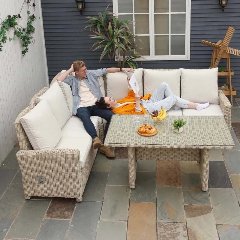 Check out this Outsunny 45-piece rattan garden sofa set with two 2-seater sofas, corner chair, middle chair and a coffee table that we can be sure will compliment your outdoor living space perfectly. The modern designs mean you can tuck the sofa into a nice corner of your garden making the most out of your space. Constructed from a metal frame and covered in a PE rattan wicker, this garden sofa set is durable, strong and will last for years to come. The extra wide seats, high back and arm rests will keep you and a few friends supported and completely comfortable for hours on end especially with the reclining seat feature for you to sit back and relax. The thick cushions, each have a zip making them easy to remove to wash and maintain yourself at home. The dining table has ample of space for you and your friends to rest your drinks, snack bowls of even to eat dinner around, finished with a tempered glass top for easy cleaning and a stylish design. If you are looking for a relaxing and modern rattan garden sofa set, this is the one for you.
