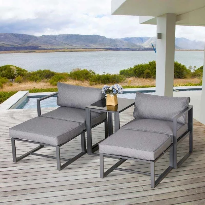 - Five-piece set formed of two outdoor armchairs, two footstools and a matching coffee table