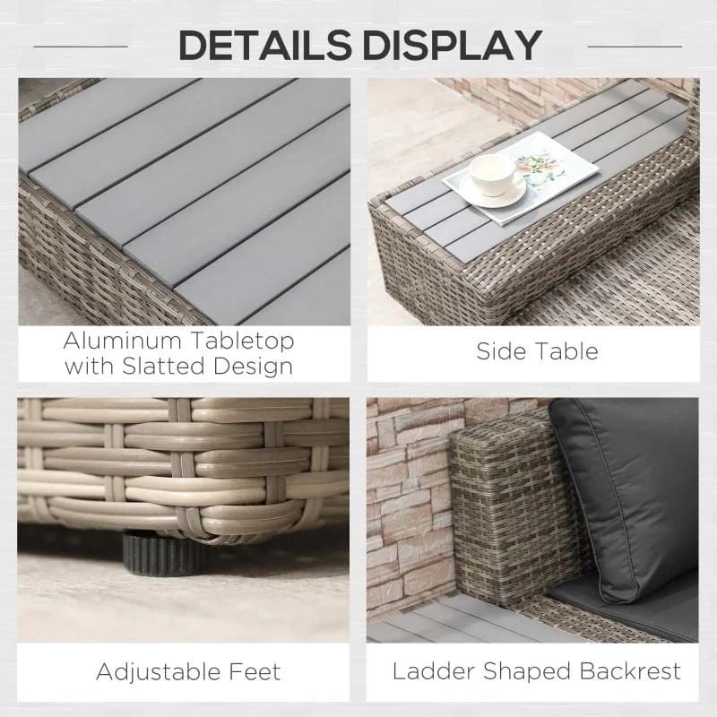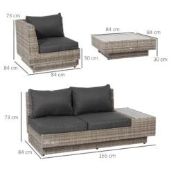 Check out this Outsunny 4pcs garden furniture set, complete with 2 loveseats, 2 side tables, corner seat and square coffee table perfect for you and your family and friends to enjoy each-others company in the comfort of your own garden. The included cushions on the seat and back rests will keep you supported and comfortable for hours on end and the zipper covers are easily removed to be washed and maintained. The compact side tables and coffee table is ideal for resting multiple drinks and snack bowls, the coffee table is also lightweight so can be manoeuvred to your preferred position. Constructed from a strong metal frame, this garden set is durable, weather resistant and will last for years to come. The side and coffee tabletops are finished off with an elegant wood effect so we can be sure the modern design is ideal for any outdoor living space and will compliment your garden.