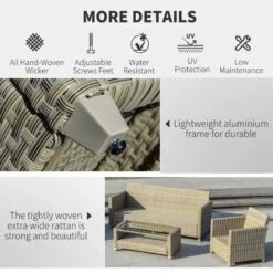 Check out this Outsunny 4-piece rattan garden furniture set with 2 armchairs, 3-seater sofa and coffee table that we can be sure will compliment your outdoor living space perfectly. The design mean you can tuck the furniture set into a nice corner of your garden making the most out of your space. Constructed from a metal frame and covered in a PE rattan wicker, this garden furniture set is durable, strong and will last for years to come. The extra wide seats, high back and arm rests will keep you and a few friends supported and completely comfortable for hours on end. The thick cushions, each have a zip making them easy to remove to wash and maintain yourself at home. The coffee table is light weight so is easily manoeuvred to your preferred position, even with the elegant glass top finish, what more, the added under shelf is handy for keeping your phone, books and much more. If you are looking for a relaxing and classic design rattan garden furniture set, this is the one for you.