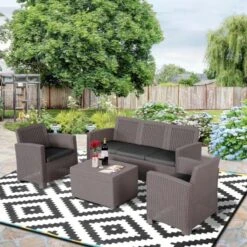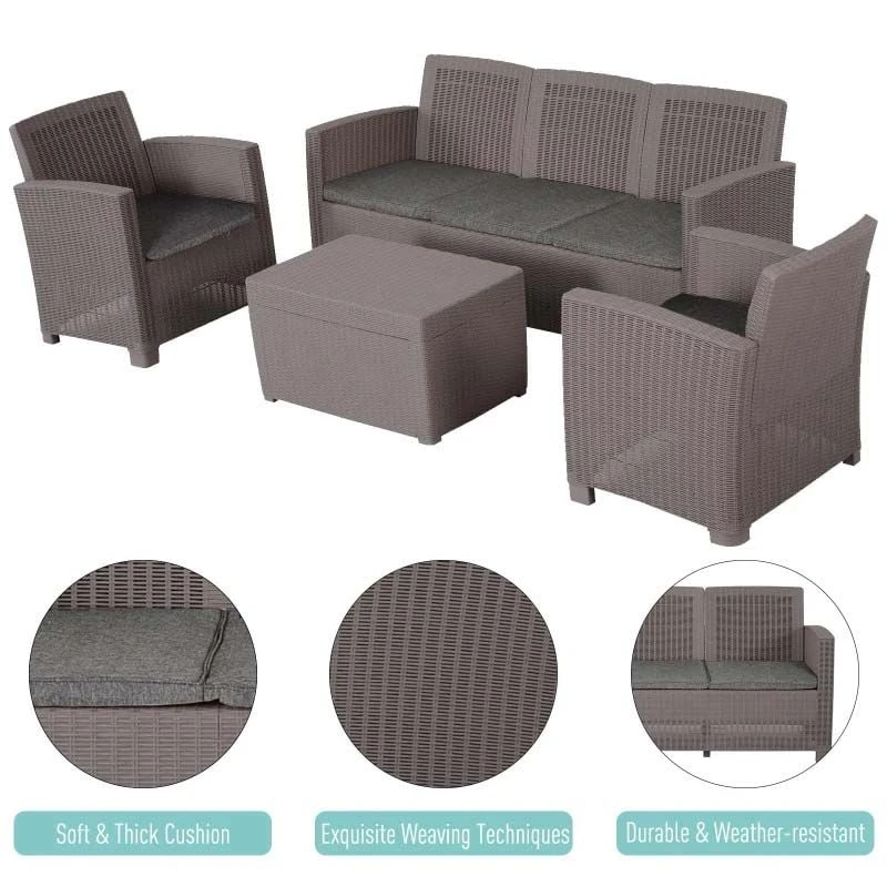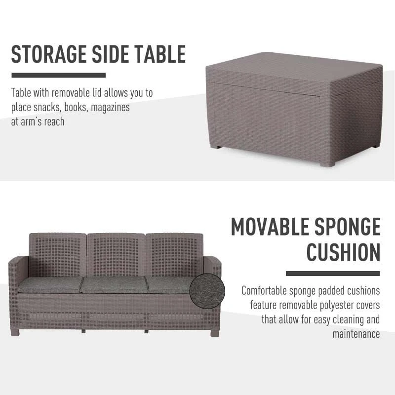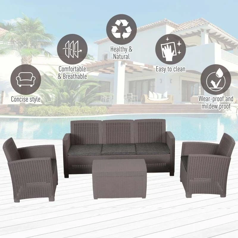 Check out this Outsunny 4-piece rattan effect garden furniture set with 3-seater sofa, 2 arm chairs and coffee table that we can be sure will compliment your outdoor living space perfectly. The design mean you can tuck the furniture set into a nice corner of your garden making the most out of your space. Constructed from PP rattan effect wicker, this garden furniture set is durable, strong and will last for years to come. The extra wide seats, high back and arm rests will keep you and a few friends supported and completely comfortable for hours on end. The thick cushions, each have a zip making them easy to remove to wash and maintain yourself at home. The coffee table is light weight so is easily manoeuvred to your preferred position, what more, lift the tabletop to reveal underneath storage ideal for keeping garden toys, blankets and much more. If you are looking for a relaxing and classic design rattan effect garden furniture set, this is the one for you.