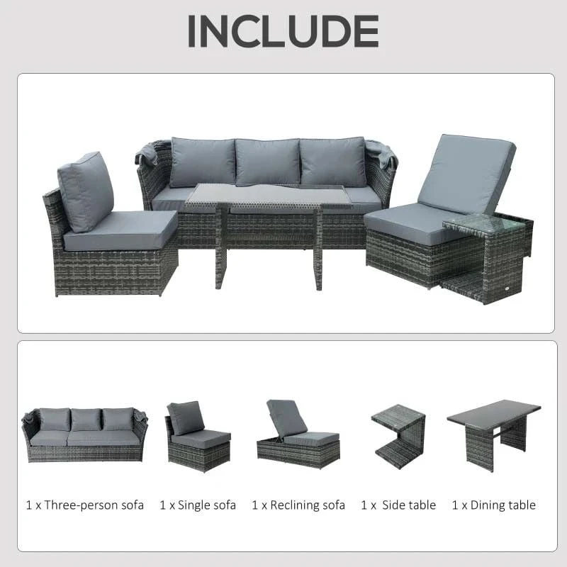 Outsunny 5-Seater Rattan Garden Furniture Set With Canopy and Recliner – Grey – 860-140