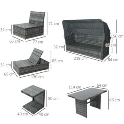 Check out this Outsunny 5-piece rattan garden furniture set with a 3-seater sofa with a canopy, single chair, reclining chair, side table and dining table that we can be sure will compliment your outdoor living space perfectly. The design mean you can tuck the furniture set into a nice corner of your garden making the most out of your space. Constructed from a metal frame and covered in a PE rattan wicker, this garden furniture set is durable, strong and will last for years to come. The extra wide seats and high backs will keep you and a few friends supported and completely comfortable for hours on end. The thick cushions, each have a zip making them easy to remove to wash and maintain yourself at home. Keep shaded on warm summer days with the added canopy with the 3-seater sofa or lay the hood flat to catch some rays. The side table is light weight so is easily manoeuvred to your preferred position, even with the elegant glass top finish and dining table has ample of space to enjoy a meal around or to rest your drinks. Sit back and relax on the reclining single chair and one side of the 3-seater sofa for ultimate relaxation. If you are looking for a relaxing and unique design rattan garden furniture set, this is the one for you.