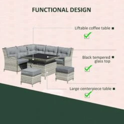 Check out this Outsunny 6-piece rattan garden sofa dining set with 2 love seats, 2 ottoman stools and an adjustable table that we can be sure will compliment your outdoor living space perfectly. The modern design mean you can tuck the sofa into a nice corner of your garden making the most out of your space. Constructed from a metal frame and covered in a PE rattan wicker, this garden sofa set is durable, strong and will last for years to come. The extra wide seats, high back and arm rests will keep you and a few friends supported and completely comfortable for hours on end. The thick cushions, each have a zip making them easy to remove to wash and maintain yourself at home. The dining table is adjustable so you can easily move the top to your preferred height and is finished off with a stylish glass top for easy cleaning. If you are looking for a relaxing and modern rattan garden dining set, this is the one for you.