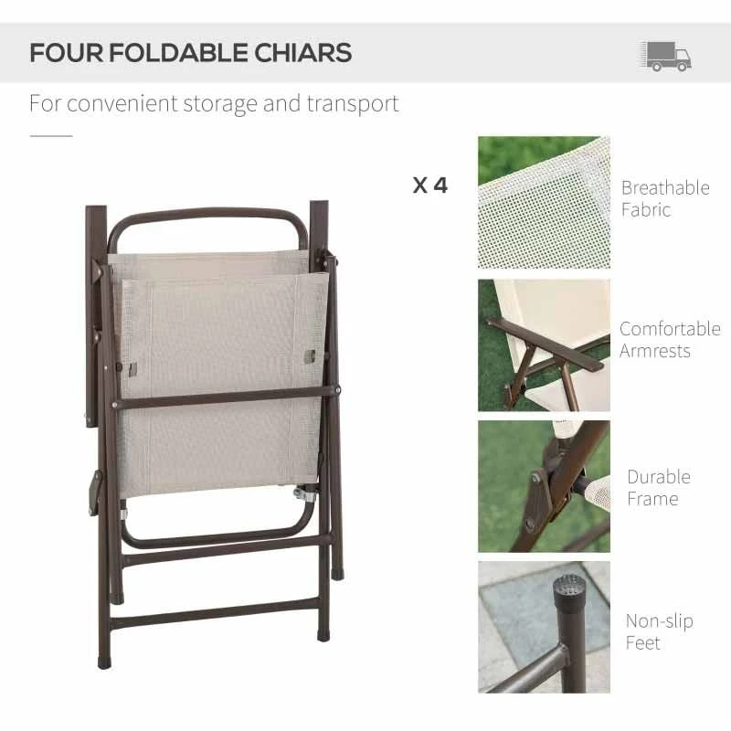 With this garden patio bistro set from Outsunny, you can add both flair and comfort to your garden. The set includes a circular table, four chairs, a matching parasol, and a hard-wearing texteline cover for the seats that provide comfort, durability, breathability. Each component is built with a powder-coated aluminium frame for dependable strength and weather resistance year-round. Each piece’s folding form makes it simple to store when not in use, making it perfect for bringing out when the sun shines.