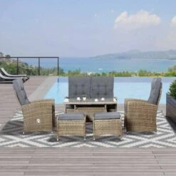 - Six pieces, comes with two-seater sofa, two reclining armchairs, two footstools and a two-tier table