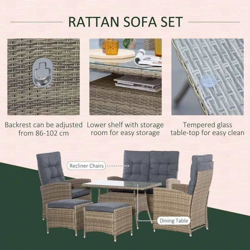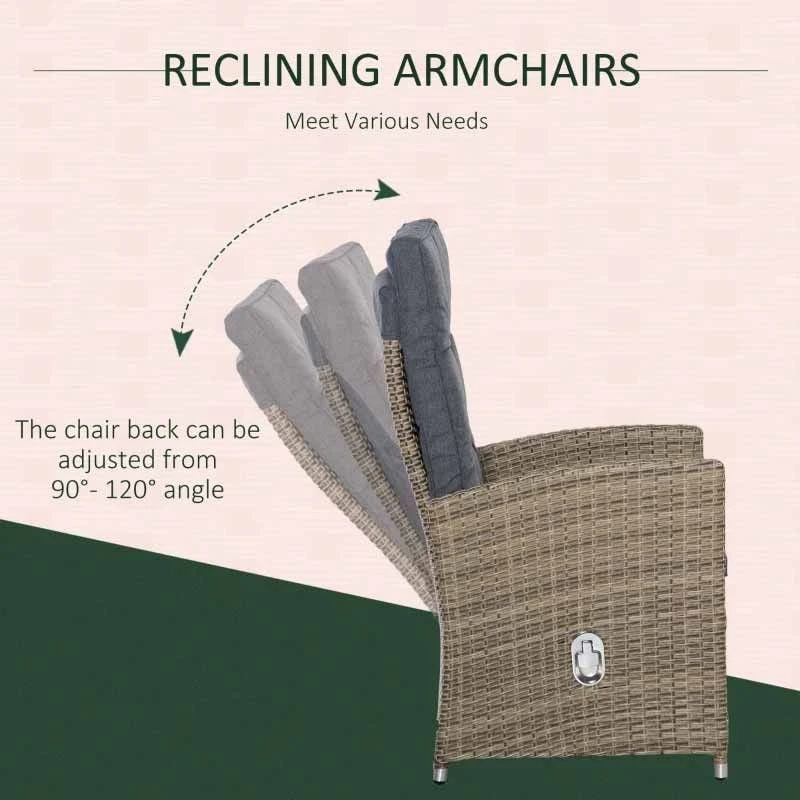 This Outsunny 6 piece patio rattan wicker table & chairs set will make your outdoor space just as inviting as your indoor space. The rattan garden dining set comes with two reclining armchairs, with cushions for extra comfort. The set is made with a powder coated strong metal core, wrapped with plastic wicker for double the durability and a top protective layer.