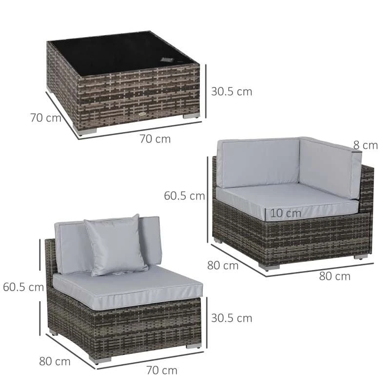 Check out this Outsunny 7-piece rattan garden sofa dining set with 2 corner chairs, 4 middle chairs and a coffee table that we can be sure will compliment your outdoor living space perfectly. The modern design mean you can tuck the sofa into a nice corner of your garden making the most out of your space. Constructed from a metal frame and covered in a PE rattan wicker, this garden sofa set is durable, strong and will last for years to come. The extra wide seats, high back and arm rests will keep you and a few friends supported and completely comfortable for hours on end. The thick cushions, each have a zip making them easy to remove to wash and maintain yourself at home. The coffee table and ideal for resting your drinks or snack bowls and is lightweight so is easily manoeuvred to your preferred position, even with the glass top finish. Keep at a horseshoe shape or sperate the seats and arrange into your preferred positions around your garden. If you are looking for a relaxing and modern rattan garden sofa set, complete with 2 scatter cushions, this is the one for you.