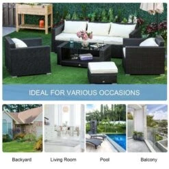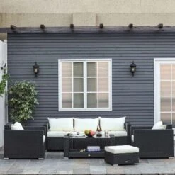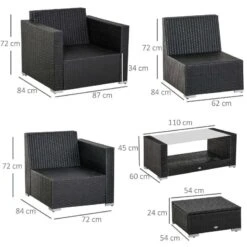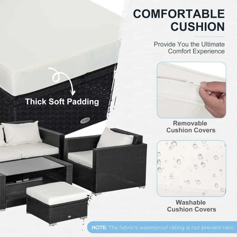 Check out this Outsunny 5-piece rattan garden furniture set with a 3-seater sofa, 2 armchairs, foot stool and coffee table that we can be sure will compliment your outdoor living space perfectly. The design mean you can tuck the furniture set into a nice corner of your garden making the most out of your space. Constructed from a metal frame and covered in a PE rattan wicker, this garden furniture set is durable, strong and will last for years to come. The extra wide seats, high backs and armrests will keep you and a few friends supported and completely comfortable for hours on end. The thick cushions, each have a zip making them easy to remove to wash and maintain yourself at home. The coffee table is light weight so is easily manoeuvred to your preferred position, even with the elegant glass top. Sit back and relax with your feet on the foot stool or use as an additional seat to entertain another. If you are looking for a stylish and unique design rattan garden furniture set, this is the one for you.