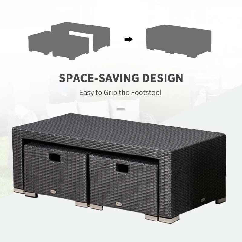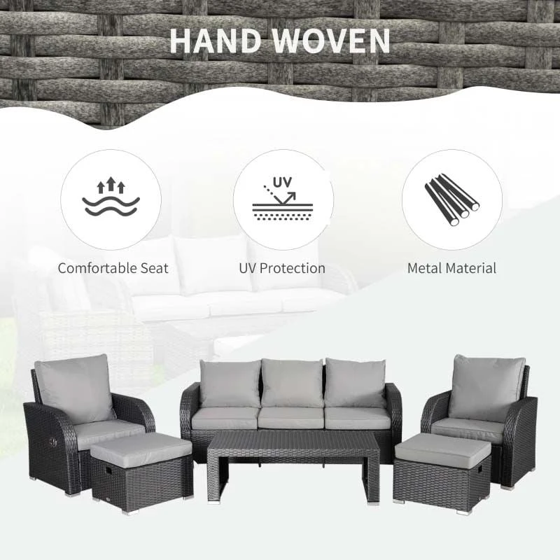Check out this Outsunny 6-piece rattan garden furniture set with 2 reclining armchairs, 3-seater soda, 2 foot stools and matching coffee table that we can be sure will compliment your outdoor living space perfectly. The design mean you can tuck the furniture set into a nice corner of your garden making the most out of your space. Constructed from a metal frame and covered in a PE rattan wicker, this garden furniture set is durable, strong and will last for years to come. The extra wide seats, high backs and armrests will keep you and a few friends supported and completely comfortable for hours on end. The thick cushions, each have a zip making them easy to remove to wash and maintain yourself at home. The coffee table is light weight so is easily manoeuvred to your preferred position and has ample of space for resting your drinks and snack bowls. Sit back and relax with your feet on the foot stools or use as additional seating to entertain a few others. The 2 single armchairs recline back when the leaver on the side is pulled for ultimate relaxation. If you are looking for a stylish and unique design rattan garden furniture set, this is the one for you.